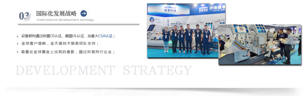 “森曼機械”作為全球門窗設備供應商,本著"seaman"精神,勇立潮頭,拼搏創(chuàng)新,以爭做行業(yè)為目標,在行業(yè)前輩發(fā)展的基礎(chǔ)上,努力學習,積極進取。目前公司產(chǎn)品涵蓋塑料門窗設備、鋁合金門窗設備、鋁幕墻設備、鋁木復合門窗設備及中空玻璃設備五大種類,近百個品種。公司產(chǎn)品銷售至全國各地及東南亞、非洲、東歐、北美等幾十個國家和地區(qū)。在這個競爭激烈的年代,我們正努力使我們的產(chǎn)品!
